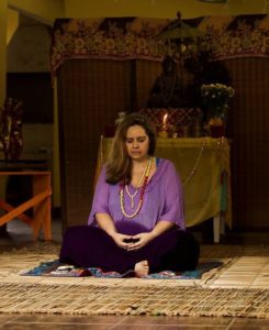 A psicóloga Fátima Bittencourt meditando no Solar dos Budas